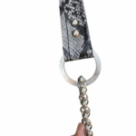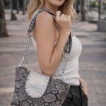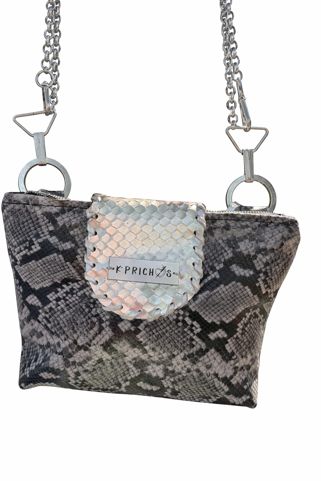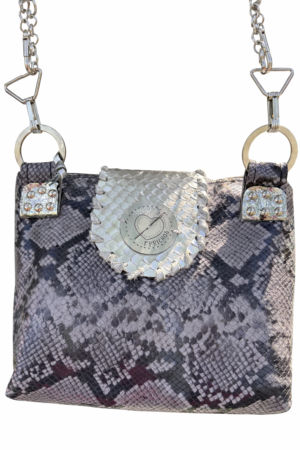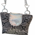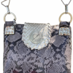 Confeccionada en cuero con estampa reptil en tonos gris y negro, con tapa frontal en cuero trabajado en escamas metalizadas que le aportan un toque único y luminoso.