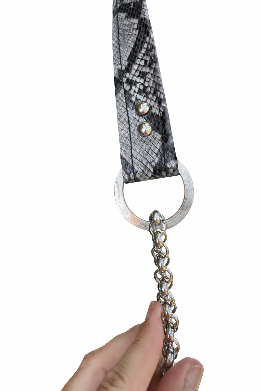 Su asa combina cuero y cadena metálica, logrando un equilibrio perfecto entre fuerza y elegancia, ideal para usar tanto de día como de noche. Los herrajes circulares y detalles metálicos realzan su estética moderna y urbana.