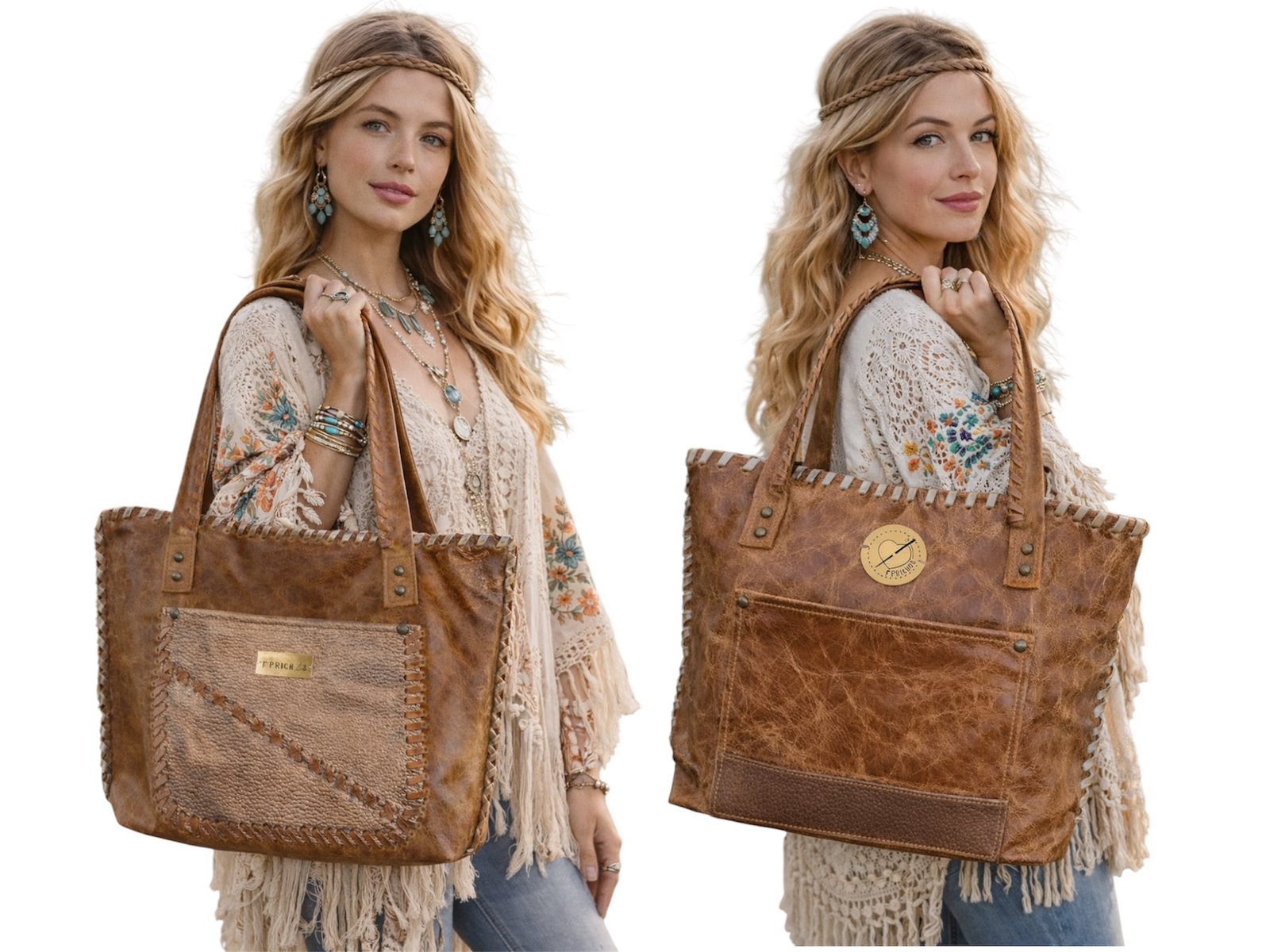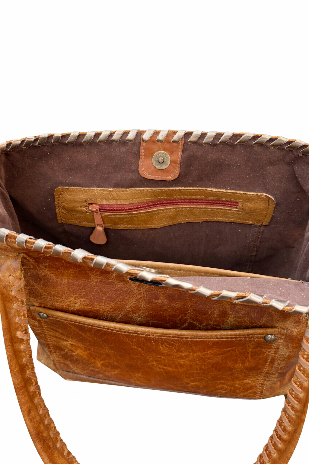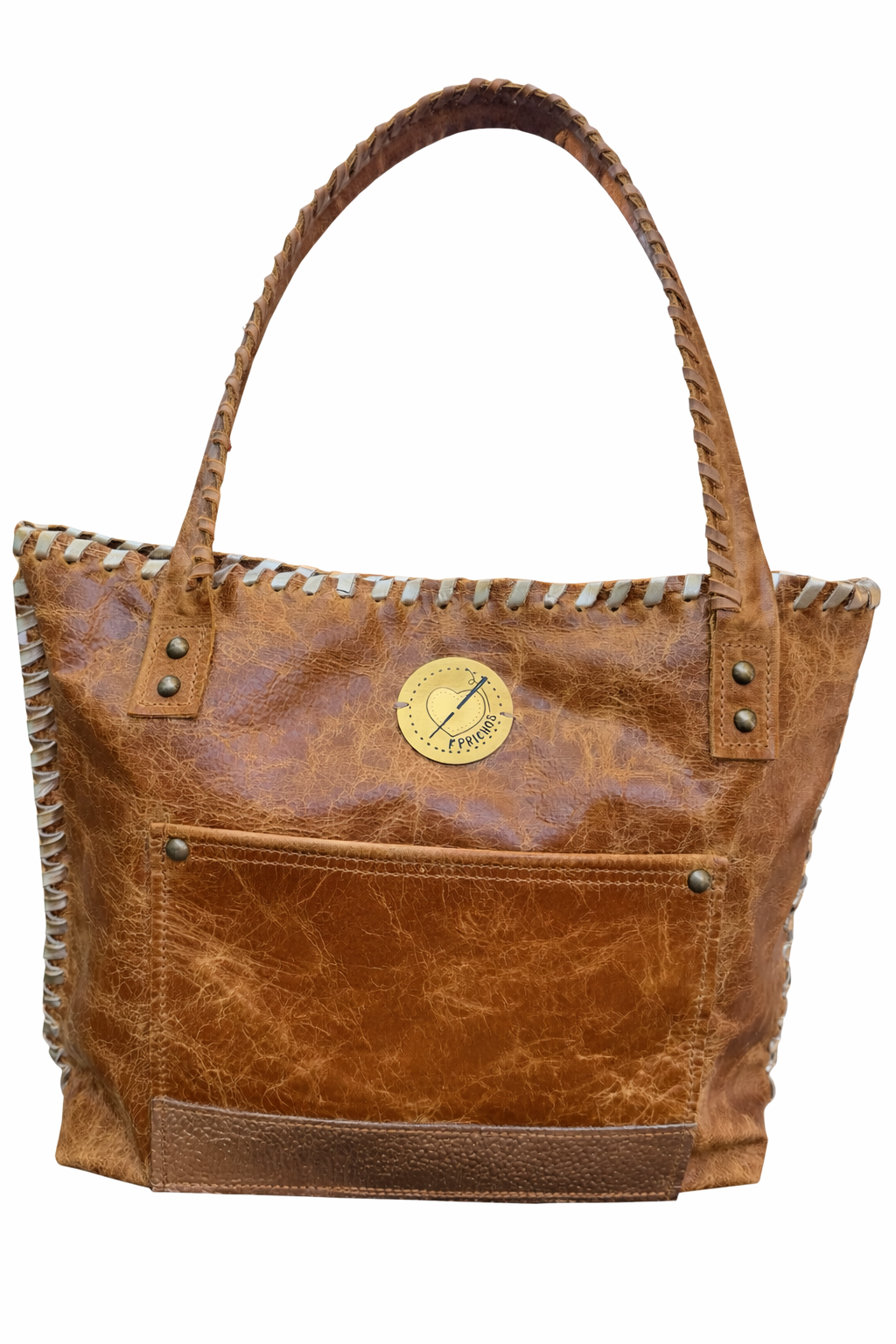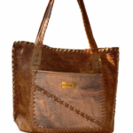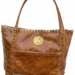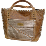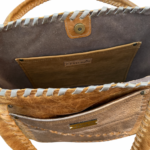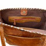 Bolso confeccionada en cuero, bordado con tientos, amplio, funcional, presenta 2 bolsillos externos y 2 internos. Cierre imán en la parte superior. Diseño exclusivo. Medidas: ancho 43 cm, alto 30 cm, base 10 cm. Asas de cuero bordada con tientos de cuero, 72 cm.