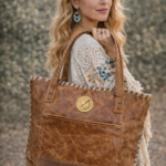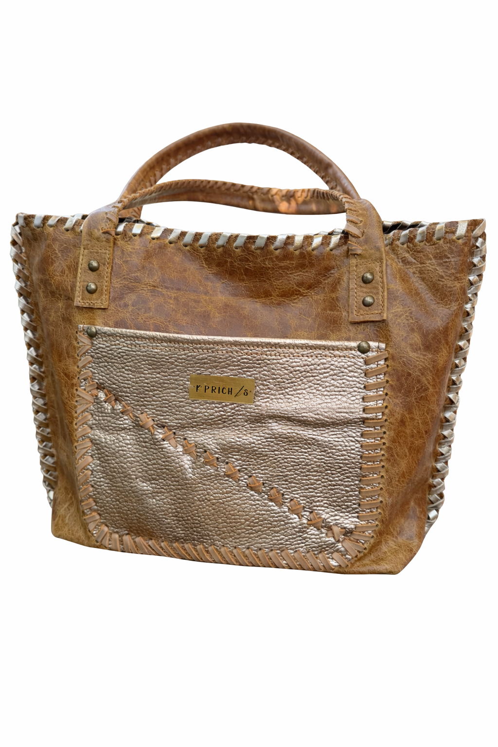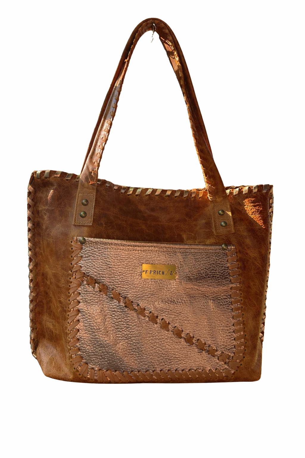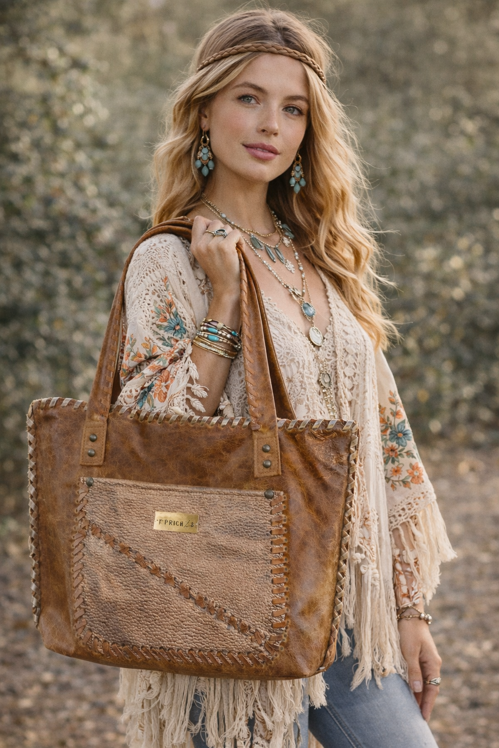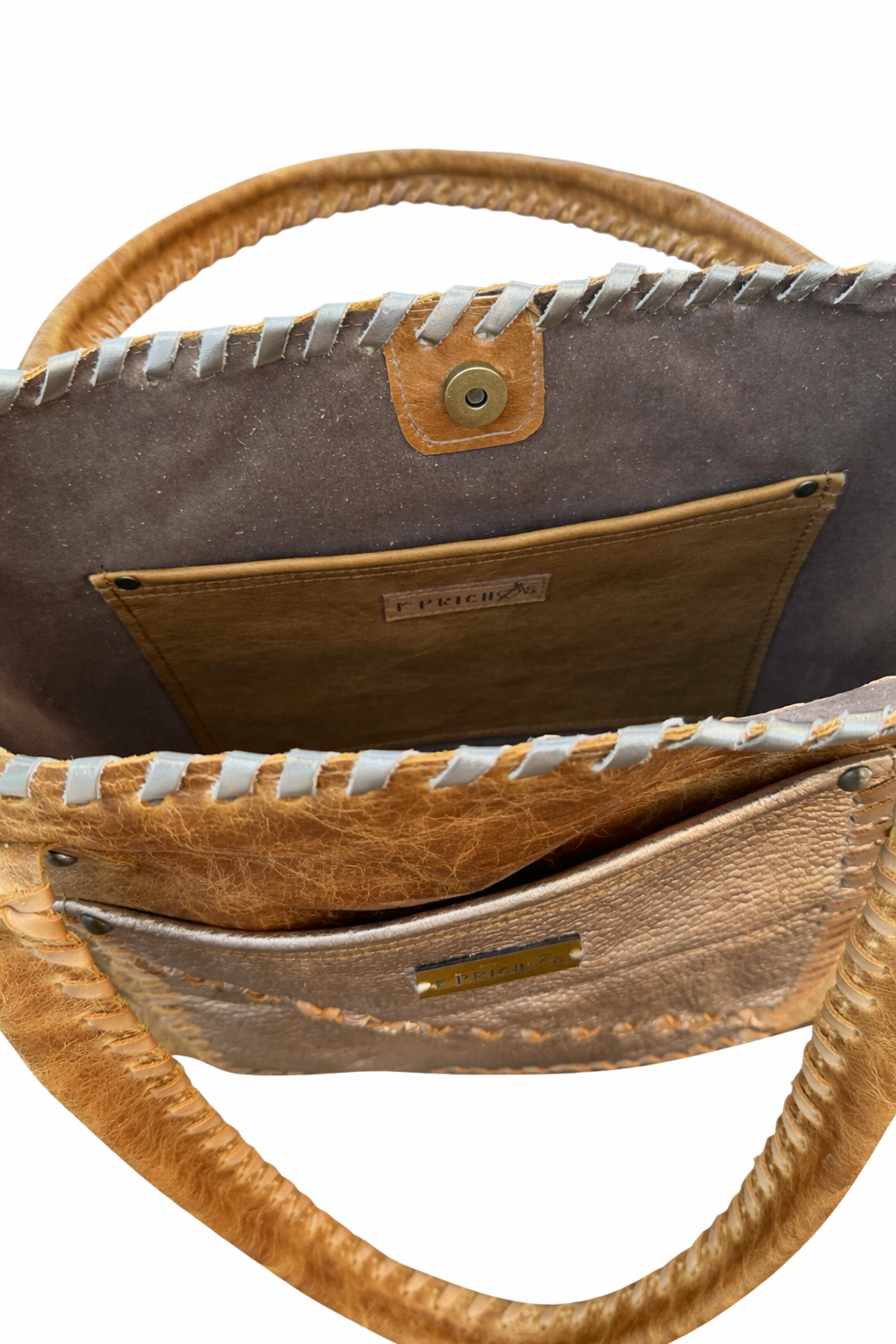 Bolso confeccionada en cuero, bordado con tientos, amplio, funcional, presenta 2 bolsillos externos y 2 internos. Cierre imán en la parte superior. Diseño exclusivo. Medidas: ancho 43 cm, alto 30 cm, base 10 cm. Asas de cuero bordada con tientos de cuero, 72 cm.