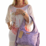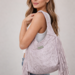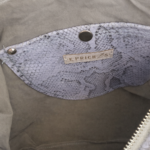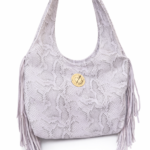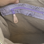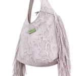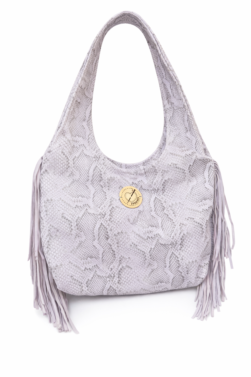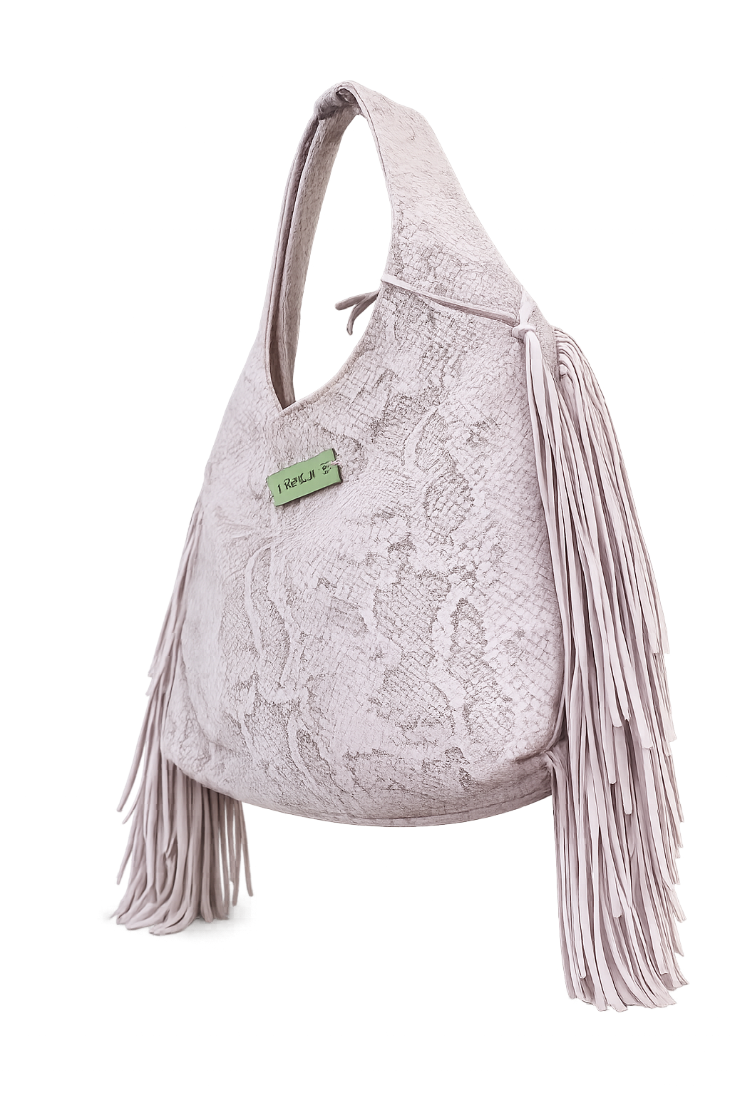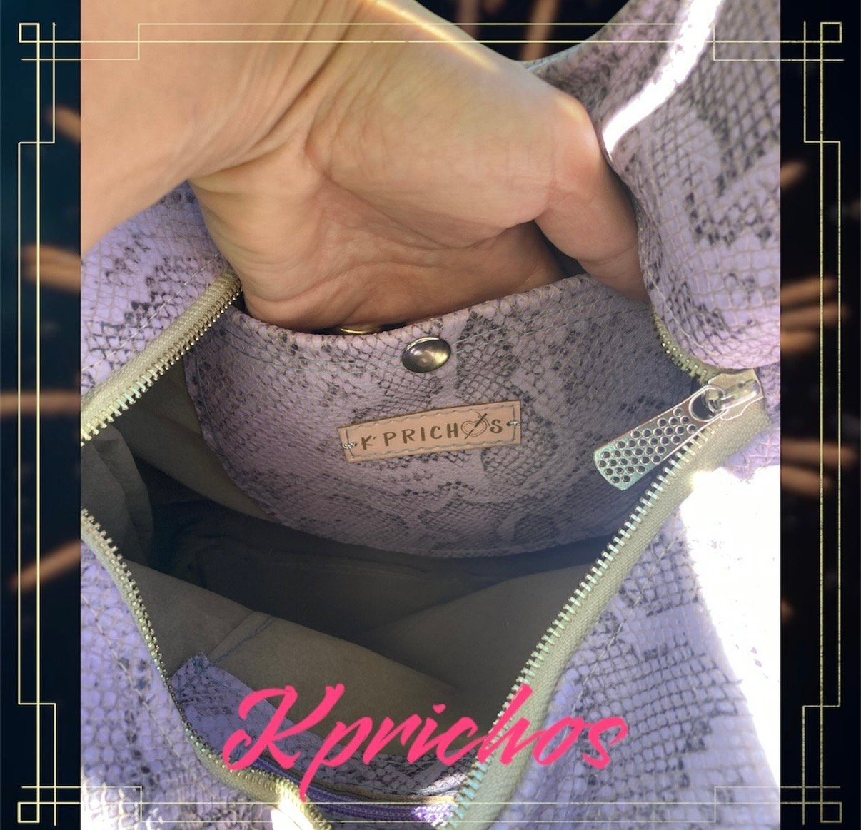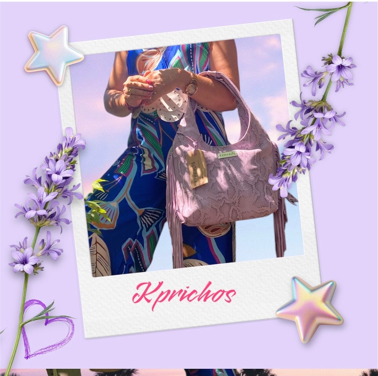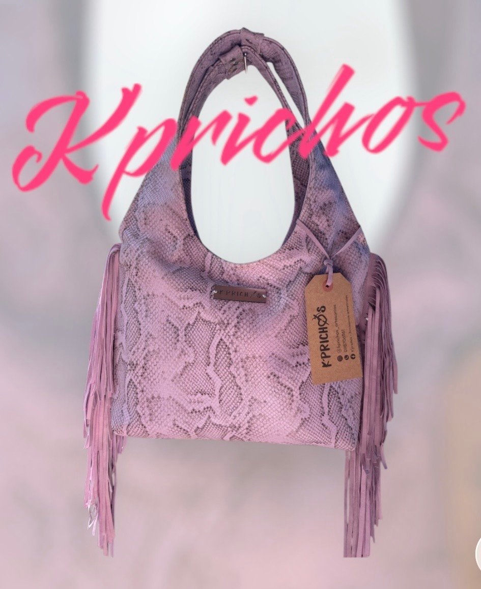 Bolso/ Cartera 100% cuero, trasmite calma, movimiento y elegancia natural. Su diseño y color lavanda con textura snake se destaca, sus flecos laterales aportan fluidez y un aire bohemio chic.