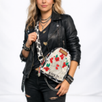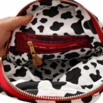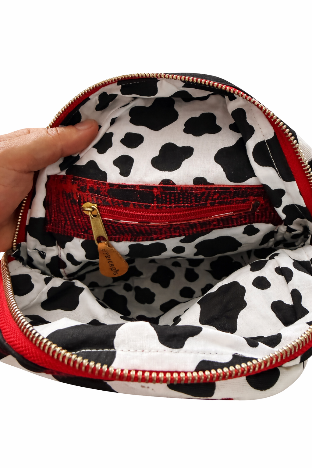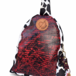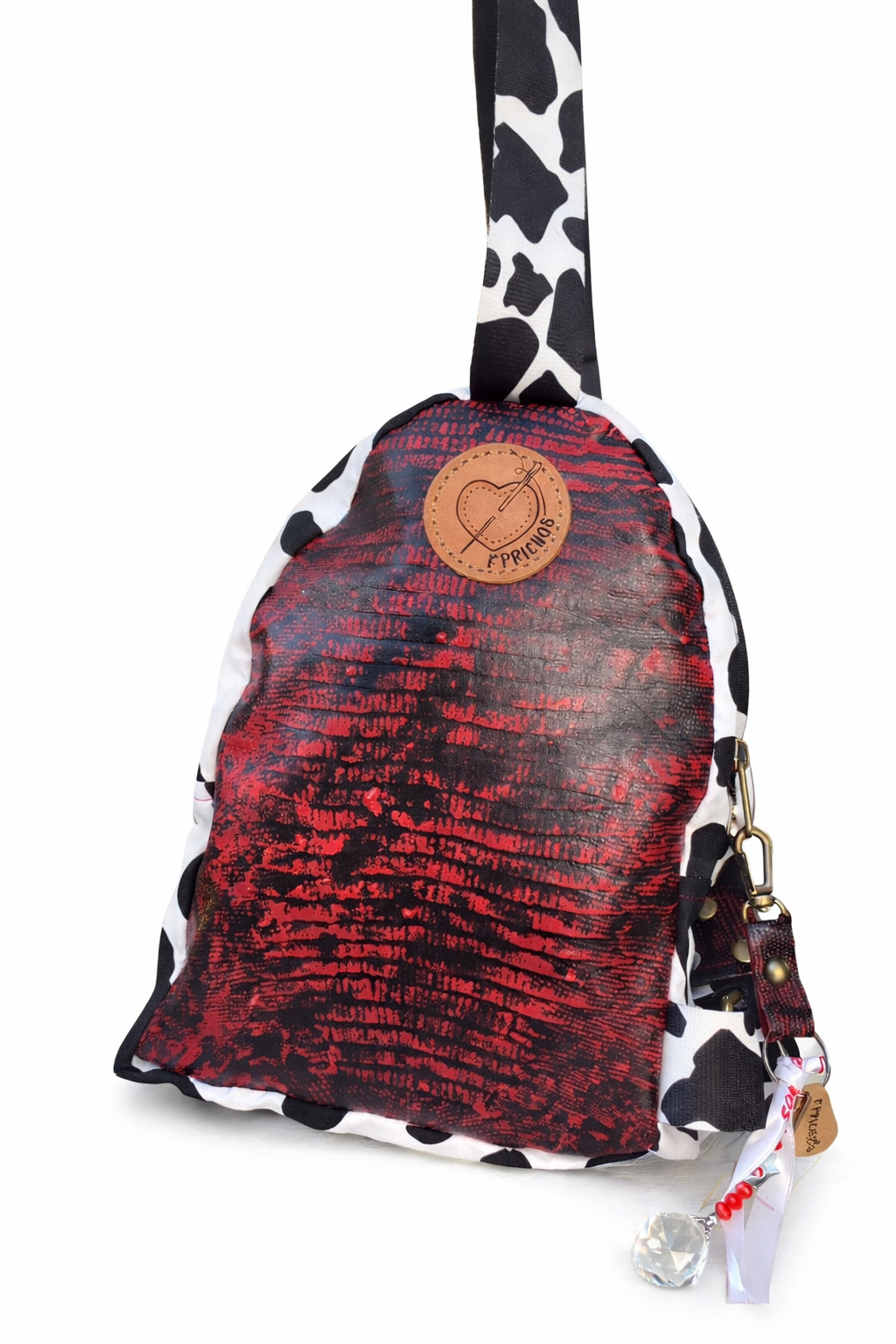 Mochila Bandolera confeccionada con un mix de texturas, textil y cuero, diseño pintado a mano. Asa de cinta sublimada, regulable. Forrada con bolsillo interno con cierre. Única y original.