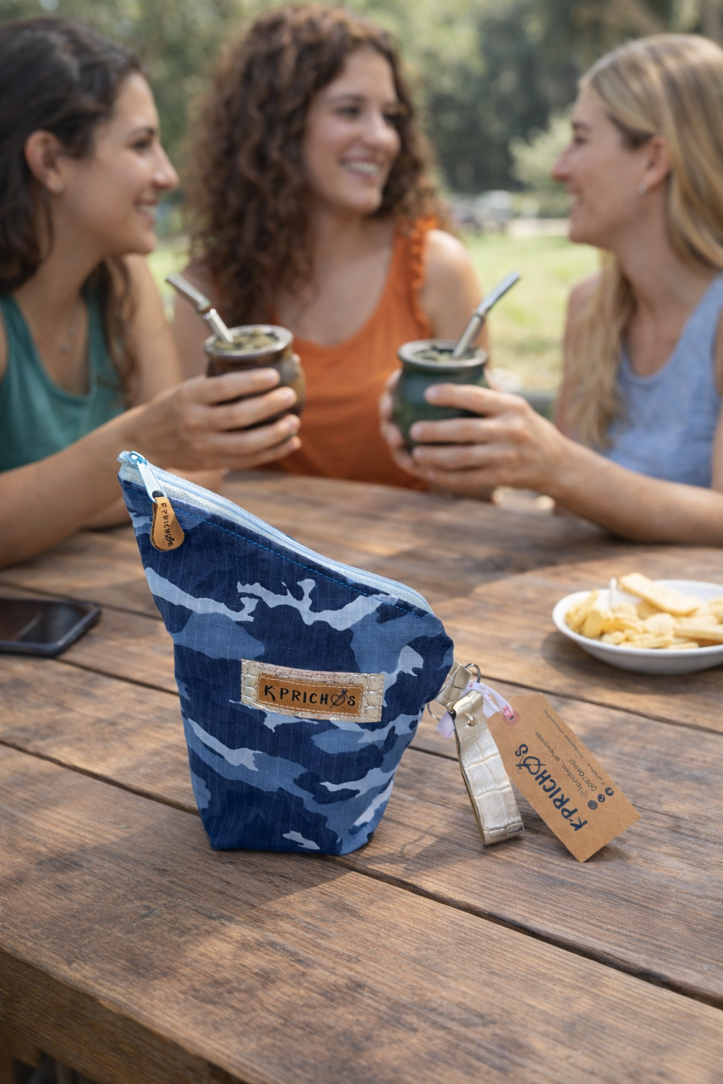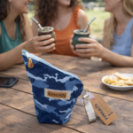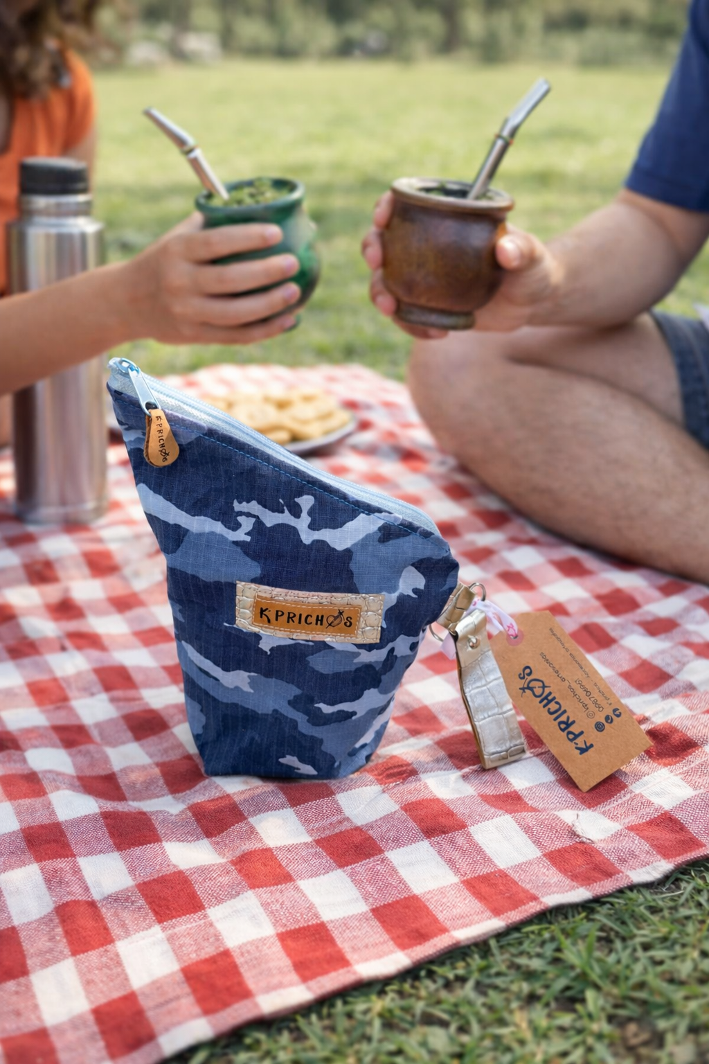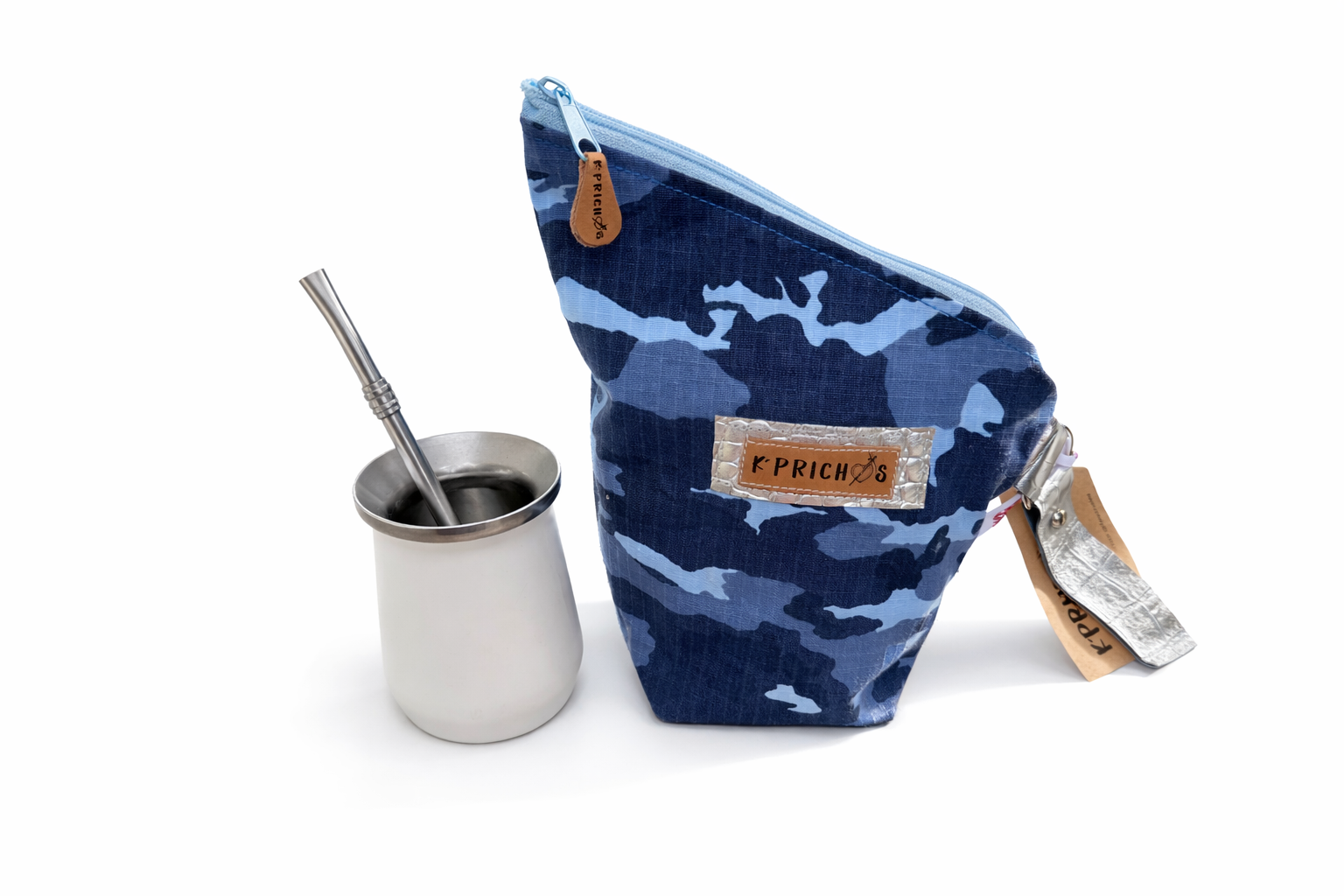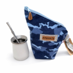 Está realizada en textil camuflado, tonos azules y celestes, cuenta con interior forrado en material impermeable, ideal para proteger la yerba de la humedad y conservarla en perfectas condiciones. Su cierre con cremallera permite un guardado seguro y cómodo, evitando derrames.